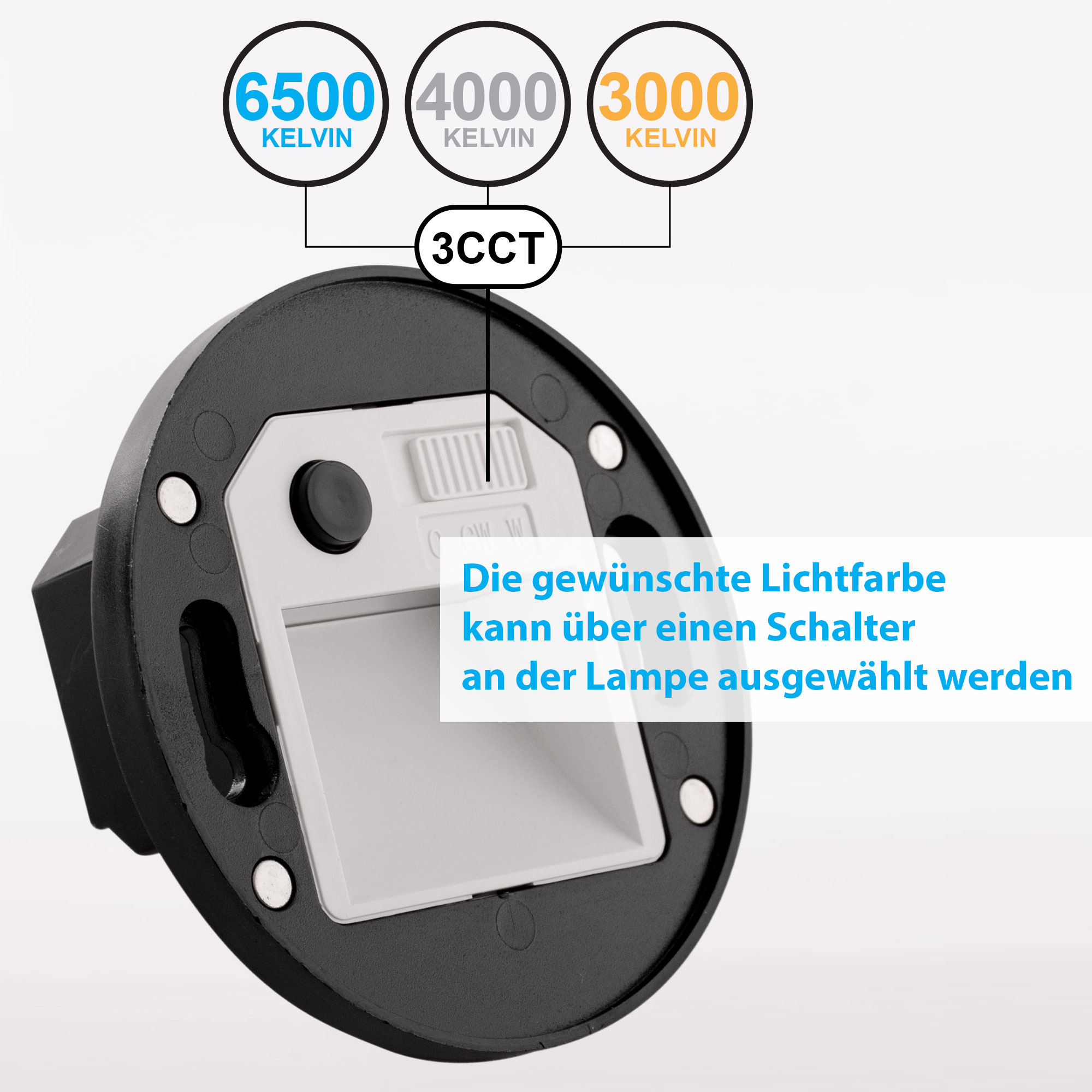 - Lichtfarbe: Einstellbar per Schalter (CCT) – Warmweiß / Neutralweiß / Kaltweiß
