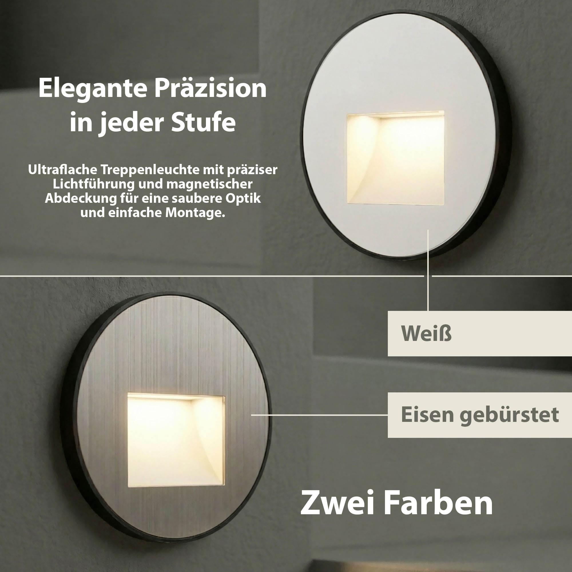 MAXKOMFORT LED Treppenlicht MOD5R– 3-CCT, Magnet-Blenden in Weiß oder Alu Gebürstet, Rund, 230V, 1,6W